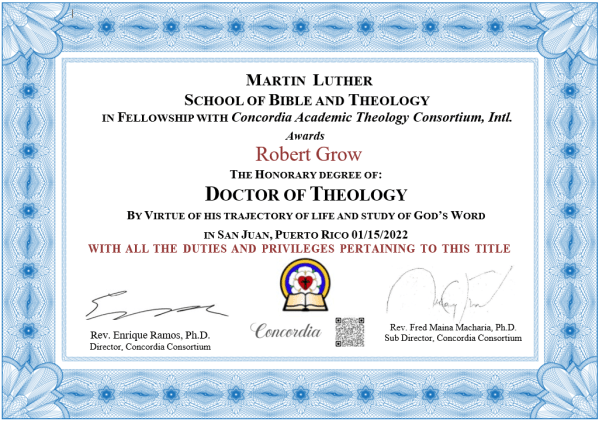 I have had contact with Dr. Enrique Ramos for quite a few years via Facebook. He just recently reached out to me and out of the blue said he and the institution he represents (along with the Sub-Director of that institution, Dr. Fred Macharia) had an award they wanted to confer upon me. He said they both were thankful and appreciative for the work I have been doing with our edited books on Evangelical Calvinism, along with the furtherance of that through my other writings (here etc). He asked me what my legal given name was, I wasn’t sure why. Then today I found out that they awarded me with an honorary Doctor of Theology (ThD) degree. The honorary doctorate is conferred by the Concordia Academic Theology Consortium International of the General Lutheran Church. The conferring school is Martin Luther School of Bible and Theology. Dr Ramos is the Director of the Consortium and Dr. Macharia the Sub-Director. I am totally humbled and honored to receive this from these brothers! It is very unexpected. I am just thankful that in some small measure the hours of work I have put in over the years is making some noticeable difference for the Kingdom. What is really encouraging to me, personally, is that this doctorate comes from a consortium of institutions whose work is for the Church catholic spanning various continents of the world. Again, I’m humbled and honored! Thank you Drs. Ramos and Macharia for this very thoughtful gesture!