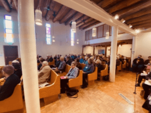 Legislative Issue Briefing: The morning began with Lutheran Advocacy Ministry – New Mexico (LAM-NM) supporters from across the state gathering at Bethlehem Lutheran (ELCA) in Santa Fe for an update on legislative issues and key bills being supported by LAM-NM during the session. Featured speakers addressed New Mexico’s abundance of revenue anticipated for FY24 and competing interests, tax reform, proposals to modernize the state’s legislature, legislation related to homelessness and lack of affordable housing in NM, and to a group of criminal justice reform bills being considered. LAM-NM works in strong partnership with the organizations represented by the speakers, including, New Mexico Voices for Children, New Mexico Coalition to End Homelessness, and ACLU – New Mexico. Participants were centered by a Bible study that began the day, led by Rev. Paul Schick.