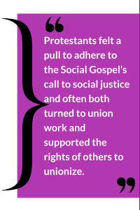 From the turn of the 19th century up until the Great Depression, labor organizers found allies in religious Americans, particularly those of Protestant affiliation. An influx of Protestant immigrants saw workers entering the “craft” trades (supported both by what is known as the Social Gospel and the Protestant Work Ethic). With significant representation in the largest group of unions in the country, the American Federation of Labor (AFL) (the largest group of unions in the country), Protestants felt a pull to adhere to the Social Gospel’s call to social justice and often both turned to union work and supported the rights of others to unionize.