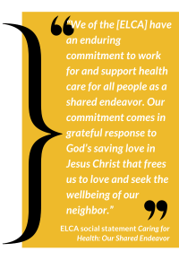 “We of the Evangelical Lutheran Church in America have an enduring commitment to work for and support health care for all people as a shared endeavor. Our commitment comes in grateful response to God’s saving love in Jesus Christ that frees us to love and seek the wellbeing of our neighbor.” – ELCA Social Statement Caring for Health: Our Shared Endeavor.