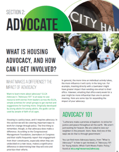 The “Advocate” section contains information and activities to help participants become effective housing and homelessness advocates. It includes helpful information on the roots of Lutheran advocacy, housing policy, insights from leaders and more.