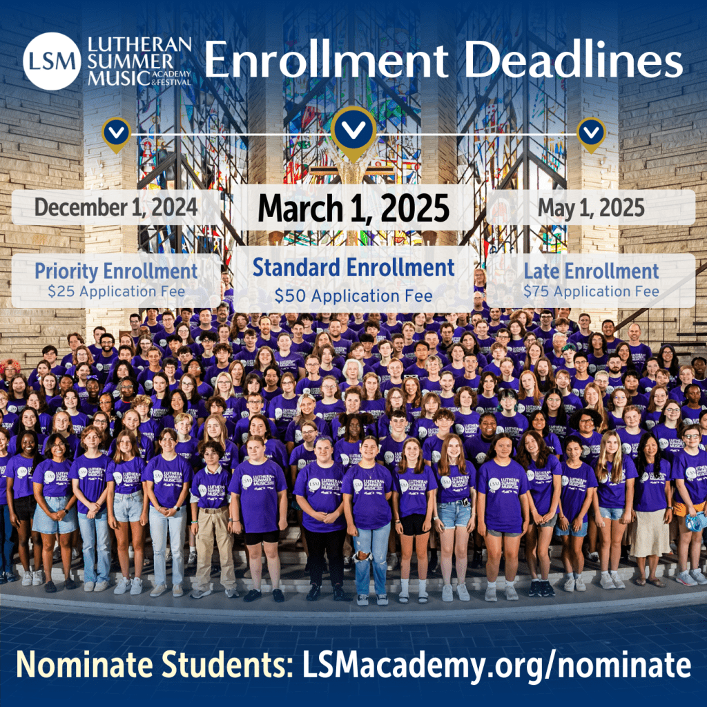 Youth musicians from across the country are headed to Valparaiso University this year for the 2025 Lutheran Summer Music Academy & Festival (LSM). Students in grades 8-12 will be immersed in a supportive community that nurtures their musical growth, and invites them to share their musical gifts in performance and in worship. With the Standard Enrollment deadline approaching on March 1, now is the perfect time to nominate students so their families can directly receive information and an invitation to apply. Do you know young musicians who would thrive at LSM? Nominate them today at LSMacademy.org/nominate.