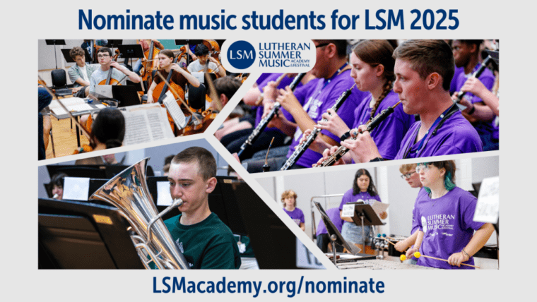 LAST CALL for LSM 2025! Enrollment for this summer is over 80% full, but there’s still time for young musicians to apply and for you to nominate students. Lutheran Summer Music is the nation’s premier faith-based music academy for high school musicians. Students come together from around the country for a joyful summer of music-making through large ensembles (band, choir, orchestra), chamber music, private lessons and elective classes (conducting, composition, jazz, musical theater, handbells, pipe organ) and use their musical gifts in performance, and in worship.