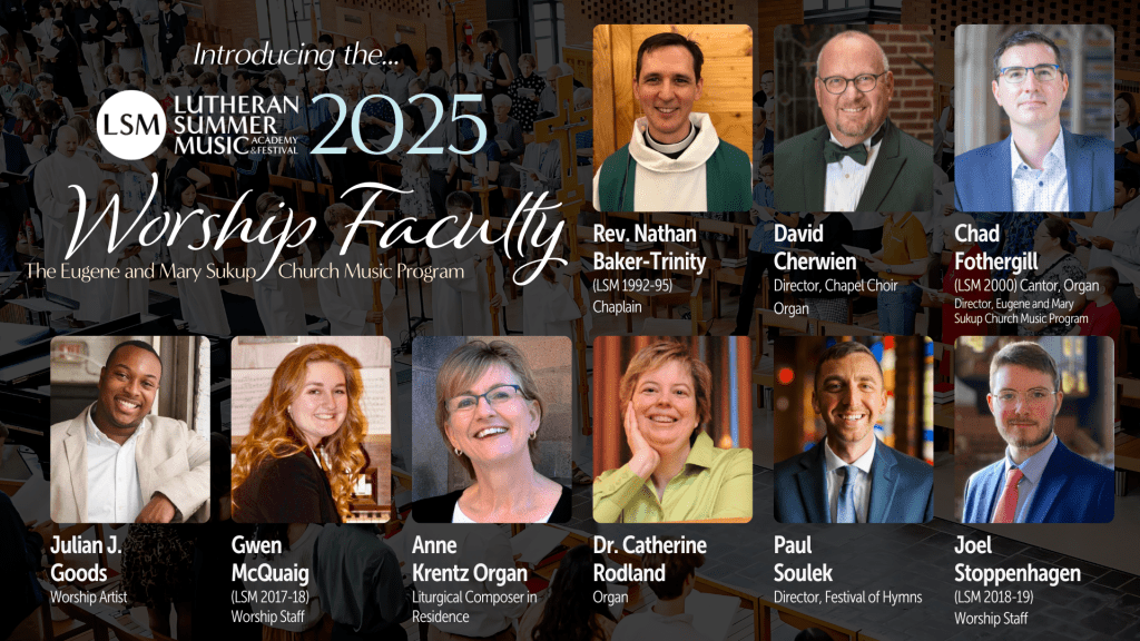 Lutheran Summer Music (LSM) is delighted to announce the 2025 Worship Faculty of The Eugene and Mary Sukup Church Music Program, led by Cantor Chad Fothergill (LSM 2000). These gifted and highly respected leaders will guide students and the broader LSM community through a rich tapestry of sacred music experiences during morning and evening prayer, rehearsals, concerts, and more.