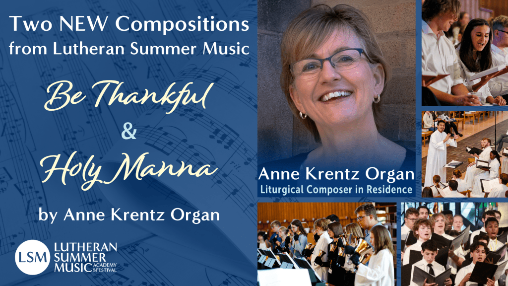 Introducing two FREE compositions from Lutheran Summer Music by Anne Krentz Organ: Holy Manna, for solo instrument with keyboard accompaniment, and Be Thankful, for SATB chorus, descant, keyboard accompaniment, optional: assembly, handbells. Free sheet music download: https://www.lsmacademy.org/resources