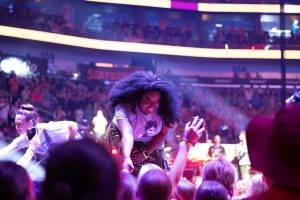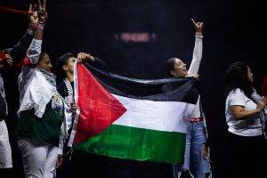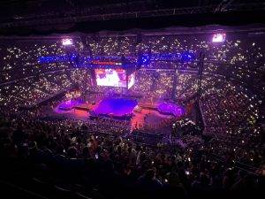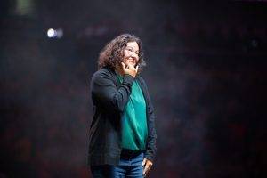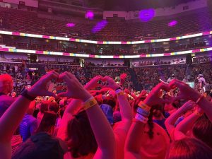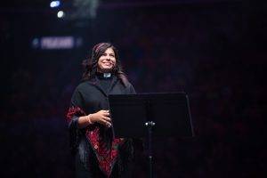 Sally Azar, the first female Palestinian pastor in the Holy Land, shared her remarkable journey from attending the ELCA Youth Gathering as a student in 2012 to addressing 16,000 people at the Smoothie King Arena 12 years later. She said, “To be created to be disruptive means to figure out which rules shouldn’t be rules in the first place…We are not called to follow unjust rules; we are called to disrupt injustice. God created us to be a disruption!” Her powerful words emphasized the importance of challenging unjust rules and working for justice and peace in her country, deeply moving the crowd. She then invited the other Palestinian youth and staff with her on stage, where they received a standing ovation.