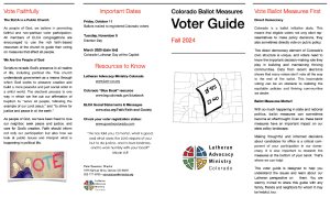 2024 VOTER GUIDE NOW AVAILABLE: Lutheran Advocacy Ministry Colorado (LAM-CO) is proud to once again publish our annual Voter Guide, a resource to walk voters through the myriad ballot measures on which Coloradans will be asked to vote this fall. This year, there will be 14 measures on the ballot, the most since 2008. The measures address everything from criminal justice and abortion to same sex marriage and wildlife management.